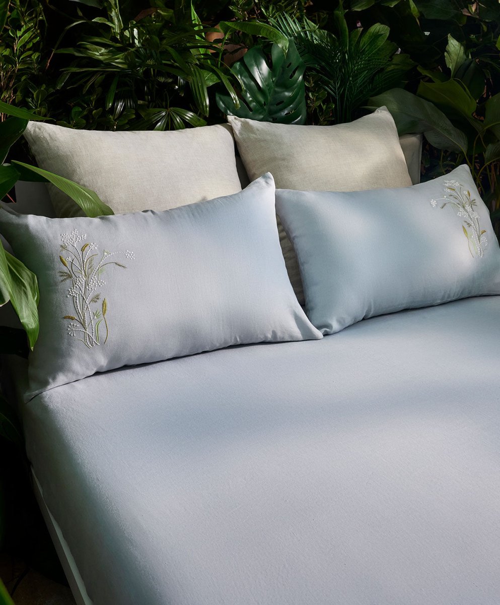 A delicate affair of floral embroidery on the shams backed by a divine cast of baby blue, a 100% linen bed sheet that endorses luxe & comfort.