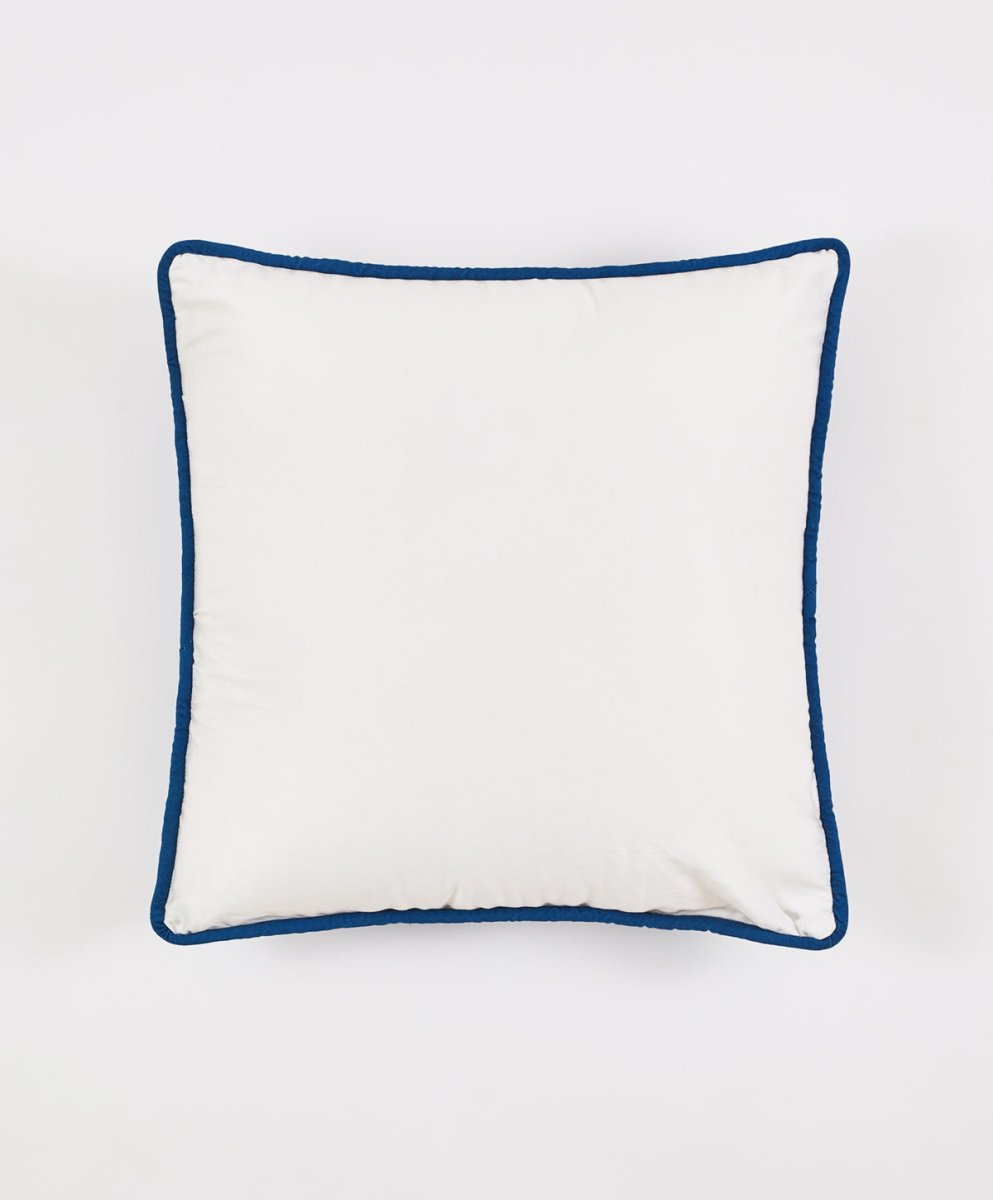 The cushion with a serene satin sheen and margins in the shades of blue cord detailings thumbs a signature style.