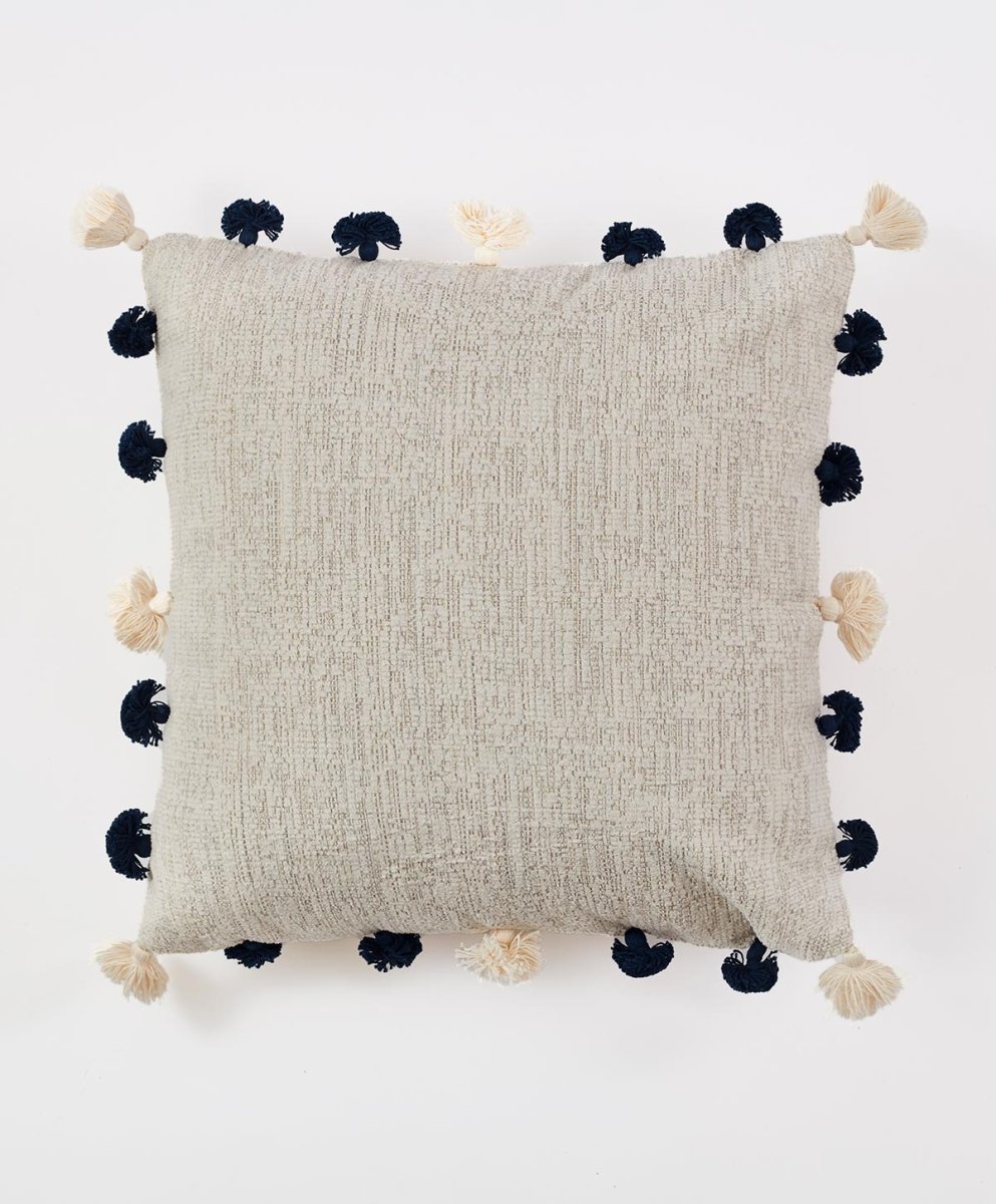 Embellished with tassels along seams, this cushion is made from fuzzy textured fabric.