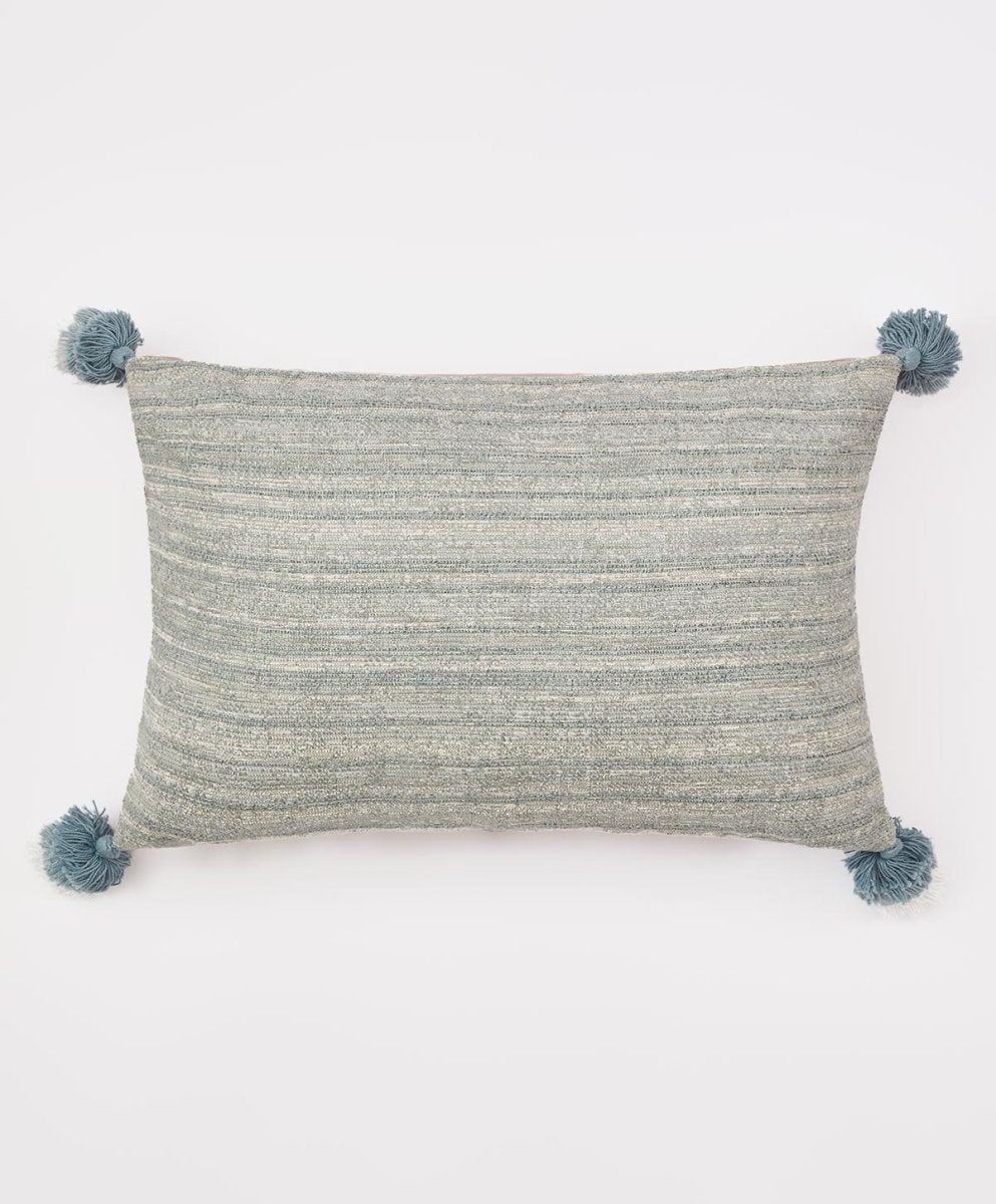 Featuring a soft, fuzzy textured fabric on the front and velvet on the back, this cushion is adorned by three-tiered tassels at each corner.
