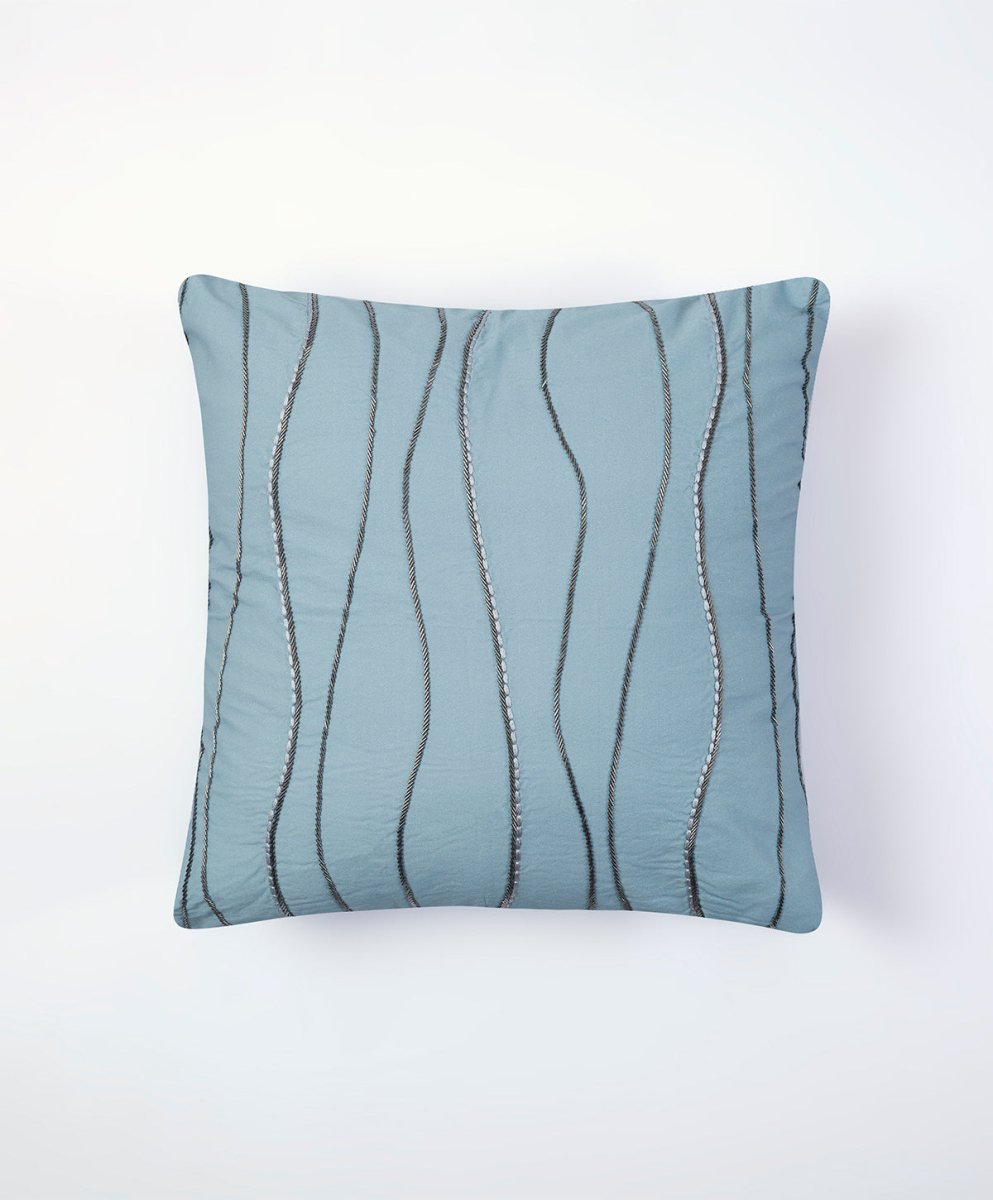 A serene canvas of sky blue, embellished with silver thread work, this 100% cotton cushion adds a touch of luxury to your dreamy nest.