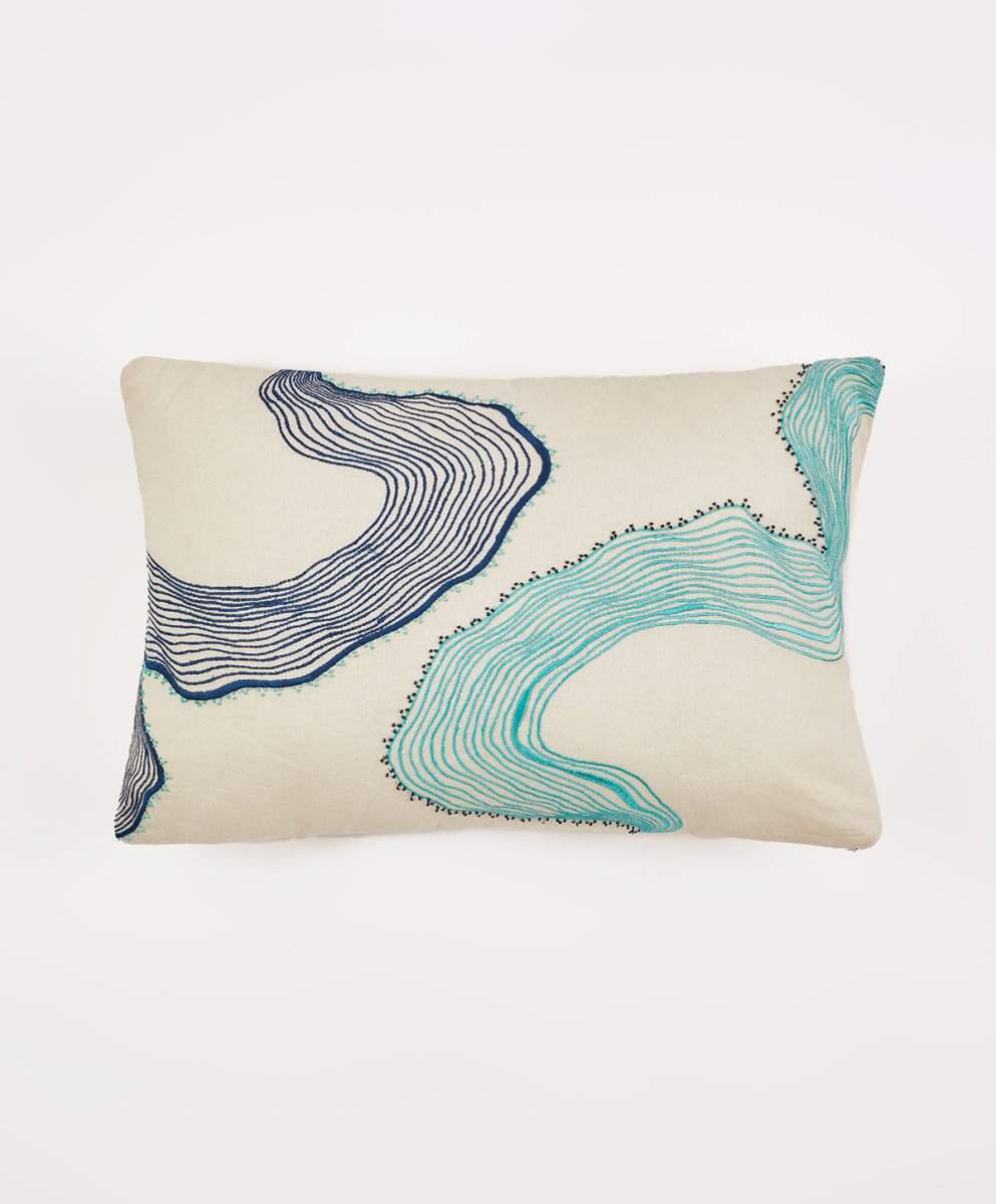 Enveloped in the ethereal shades of teals and prussian blues, this lumbar features the artistry of machined-embroidery and delicately hand-stitched pearls.