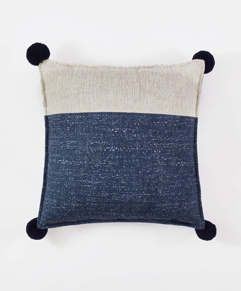 The cushion with a french seam with two contrasting distressed textured fabrics patched together in the front, with playful pom poms on the four corners.