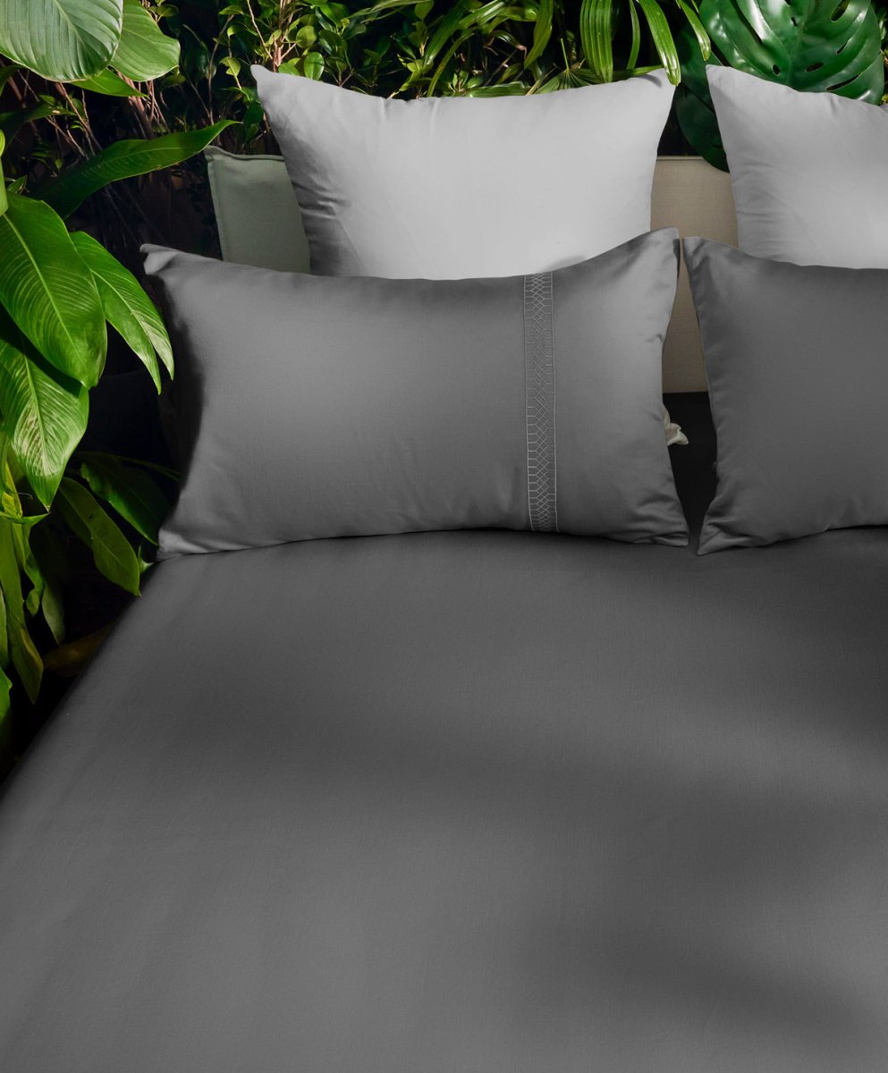 Dark grey tones meet 100% Cotton - 1000 TC satin’s gentle touch, as intricate patterns unfold, embracing every night in quiet sophistication.