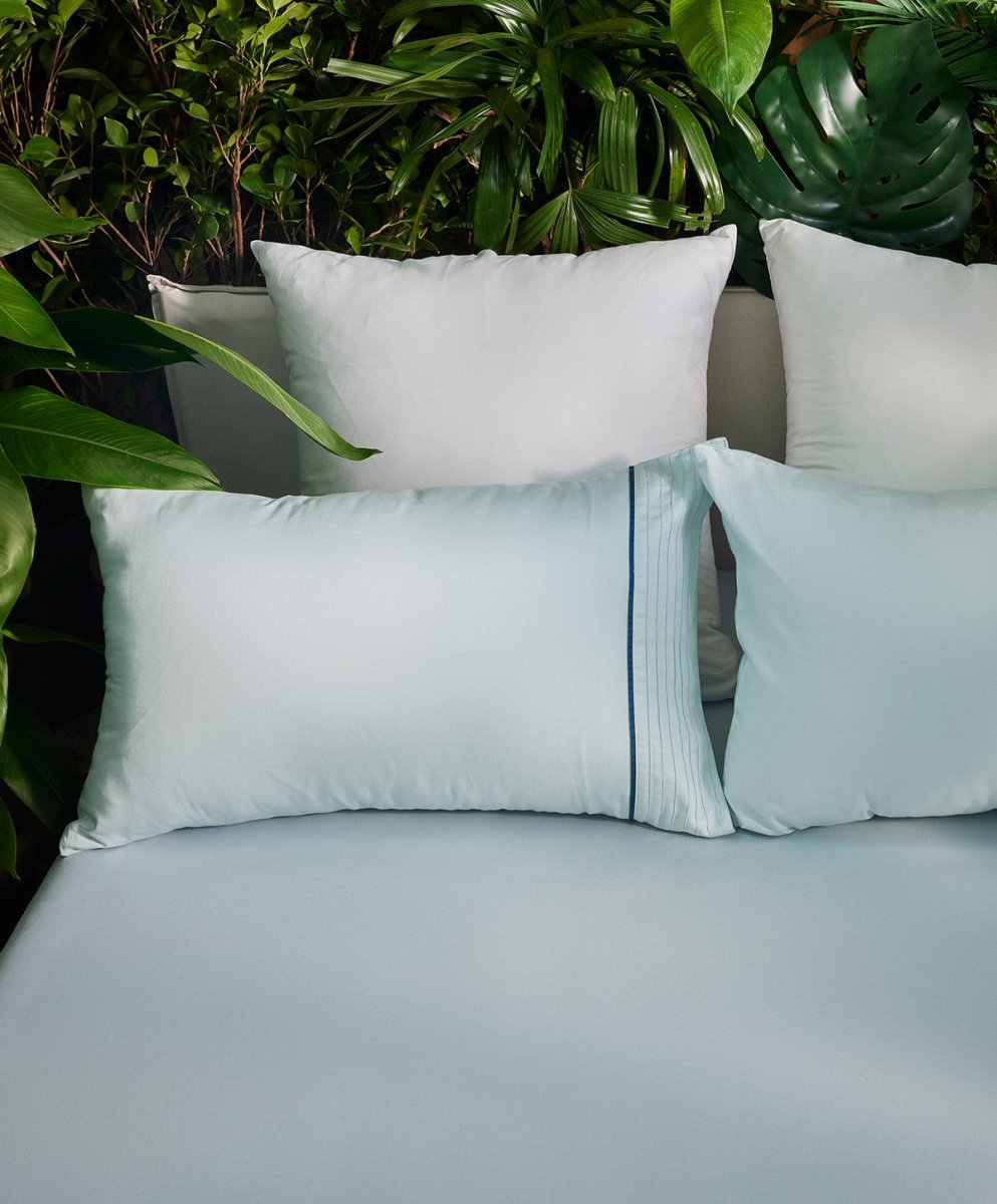 A soothing sea of blue on luxurious satin, where pin-tuck details create a rhythm of refined beauty, inviting restful nights and peaceful dreams.