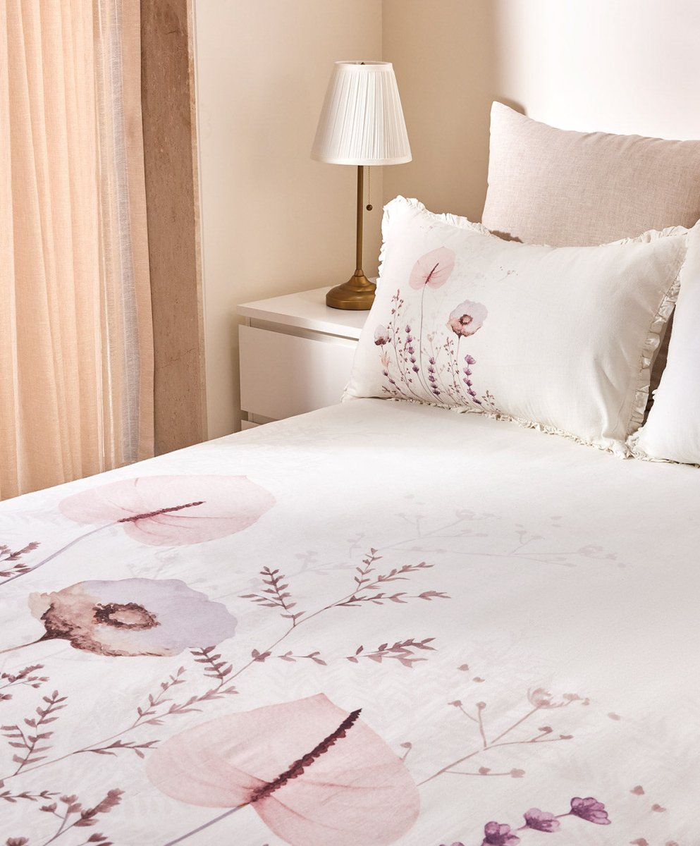 Immerse yourself in a spellbinding medley of dusty rose, pastel salmon & pearl hues, painting the enchantment of lavender & anthurium. Bringing you comfort in a luxurious cotton & lyocell blend.