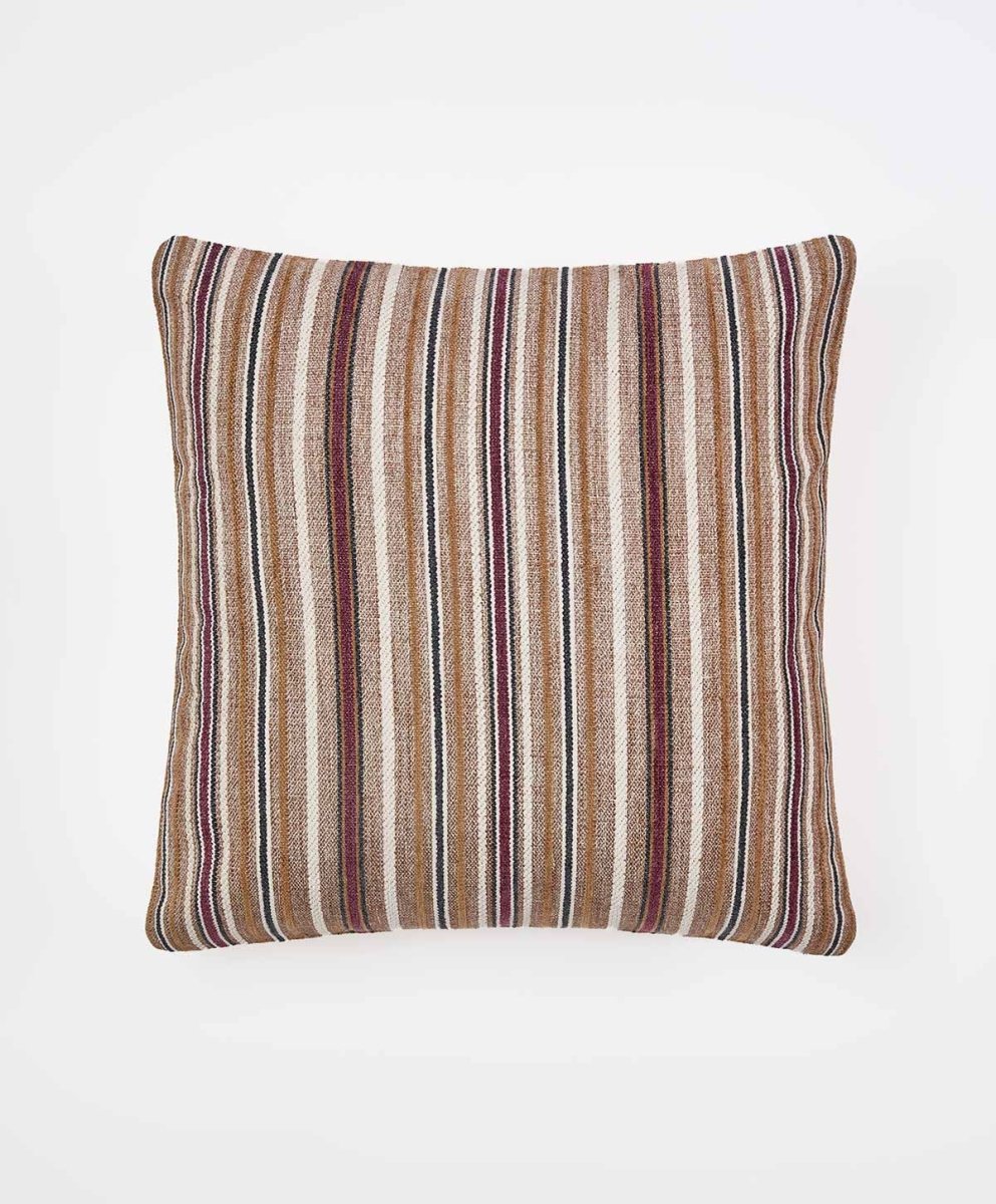 Elegant and minimal, this cushion sets in a soft and seamless tapestry of plum, beige, and honey mustard stripes. Crafted with a blend of polyester, cotton, and linen, it stands to befriend accent designs and neutral solids.